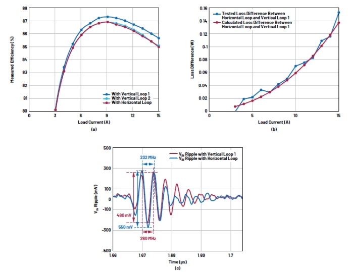 圖5.演示板測(cè)試結(jié)果:(a)效率,(b)水平回路與垂直回路1之間的損耗差異,(c) 15 A輸出時(shí)M1導(dǎo)通期間的VIN紋波