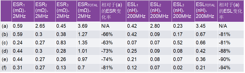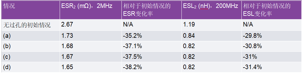 表3.使用不同過(guò)孔布置時(shí)提取的熱回路PCB ESR2和ESL2