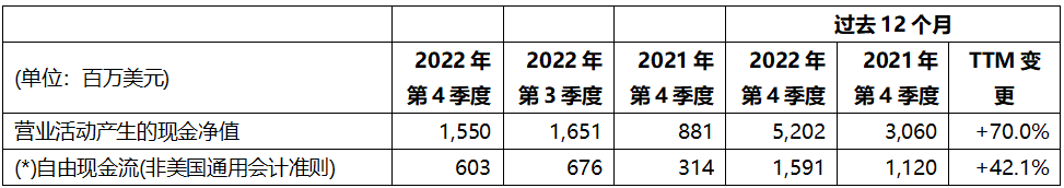 2022 年第四季度經營活動產生的現(xiàn)金凈額為 15.5 億美元,全年52 億美元,增長 70.0% ,占總營收32.3%。