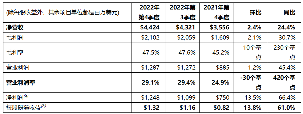 · 第四季度凈營收44.2億美元; 毛利率47.5%;營業(yè)利潤率29.1%; 凈利潤12.5億美元