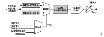 CN0554同時(shí)支持切換和抖動(dòng)功能。切換功能可以在兩個(gè)不同的DAC代碼之間快速切換DAC輸出,而無(wú)需任何SPI事務(wù),從而消除了通信事務(wù)。示例包括注入一個(gè)小的直流偏置或在通斷狀態(tài)之間獨(dú)立切換。