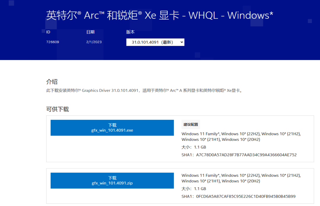 ▲2023年2月1日正式上線的31.0.101.4091 WHQL版銳炫A系列獨顯驅動也是目前英特爾官方放出的最新的WHQL版驅動,另外的4123版目前還只是Beta測試。