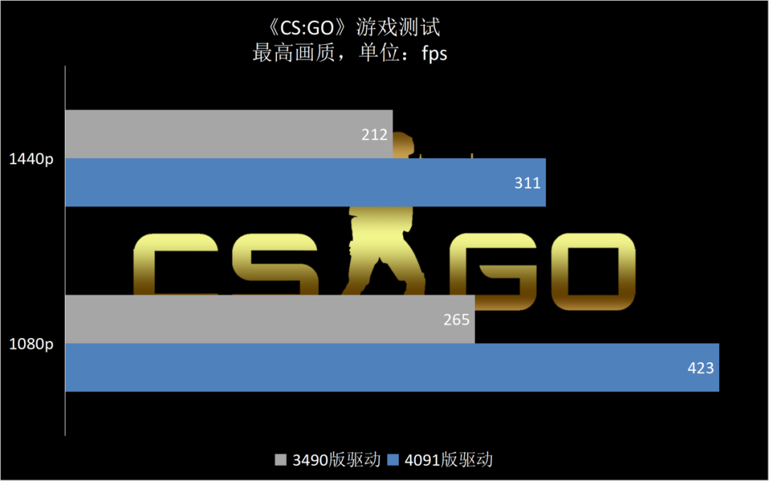 從新舊驅動的對比測試成績來看,新的4091版驅動確實在游戲性能上有了非常明顯的提升,1440p下的平均幀率從212fps左右提升到了311fps左右,1080p分辨率下的幀率則從265fps左右提升到了423fps左右。新驅動確實為A750在《CS:GO》中的表現(xiàn)注入了一針強心劑。