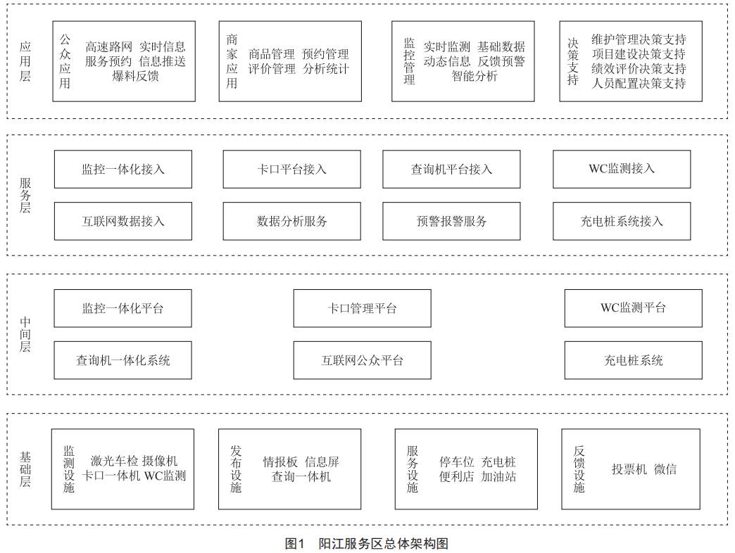 智慧服務(wù)區(qū)以"做好微創(chuàng)新,帶動小改變,實現(xiàn)大進(jìn)步"為核心理念,以實現(xiàn)內(nèi)部管理網(wǎng)絡(luò)化和對外服務(wù)智能化為目標(biāo),頂層設(shè)計注重"數(shù)據(jù)發(fā)掘"與"智慧服務(wù)",通過基于物聯(lián)網(wǎng)技術(shù)的標(biāo)準(zhǔn)化智能管控終端,依托信息化智慧服務(wù)平臺,提供高效的智能化服務(wù)。以陽江服務(wù)區(qū)為例,其整體系統(tǒng)架構(gòu)采用分層設(shè)計的方式,具體如圖1所示。