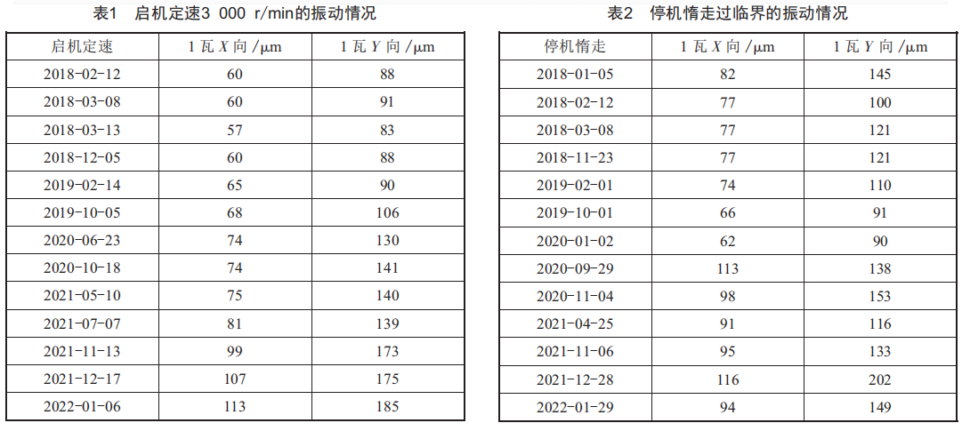 (1)從表1振動數(shù)據(jù)可以得出,自2016年5月通流改造以來,1瓦軸振緩慢增長,2021年5月開始1瓦軸振增長趨勢加劇:從表2停機過臨界數(shù)值可以得出,2020年9月停機1瓦過臨界振動數(shù)值明顯增大,至2022年1月停機1瓦過臨界振動數(shù)值有增大趨勢。