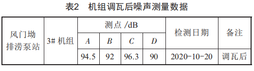 2020年10月21日,按以上改造方法對我中心風(fēng)門坳排澇泵站3#機組進(jìn)行了改造處理;10月22日,3#機組改造完畢并試機運行。改造后機組噪聲明顯有了改善,按照之前的噪聲測量方法,對3#機組四個位置的噪聲重新進(jìn)行測量,每個相同的測量位置噪聲均比原來降低了接近10dB,測量數(shù)據(jù)如表3所示。
