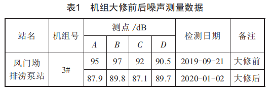 風(fēng)門坳排澇泵站3#機組更換電機定子繞組前后,技術(shù)人員均對該機組進(jìn)行了運行噪聲測量并記錄,測量數(shù)據(jù)如表1所示。
