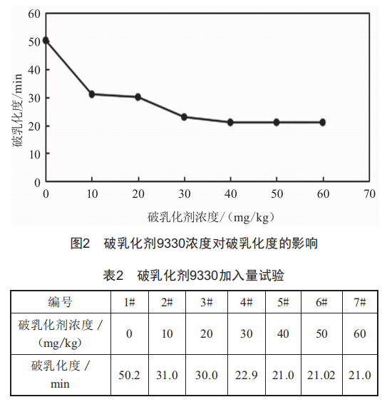 由圖2可以看出,隨著破乳化劑濃度的增大,破乳化度先減少后幾乎保持不變,當破乳化劑9330濃度為40mg/kg時,破乳化效果最好,破乳化度為21.0min。