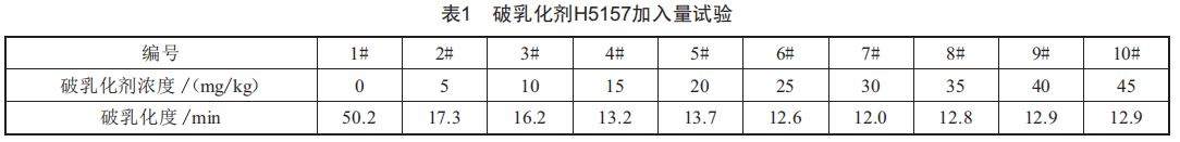因此,破乳化效果達到最好時,破乳化劑H5157的最佳添加量是15mg/kg,破乳化劑9330的最佳添加量是40mg/kg。