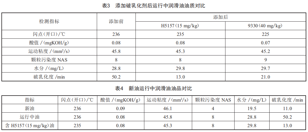 結(jié)合上文H5157、n330破乳化劑添加試驗和破乳化劑的添加對潤滑油其他指標的影響兩部分試驗結(jié)果,得出結(jié)論:潤滑油中添加破乳化劑H5157,且添加量為15mg/kg時潤滑油的破乳化效果最好,且添加后潤滑油的其他指標與添加前相比基本沒有變化:而添加破乳化劑n330后,雖然破乳化度也得到了顯著改善,但潤滑油的顆粒度超出標準值范圍,且潤滑油閃點大幅下降。因此,在實際操作中選擇使用破乳化劑H5157。
