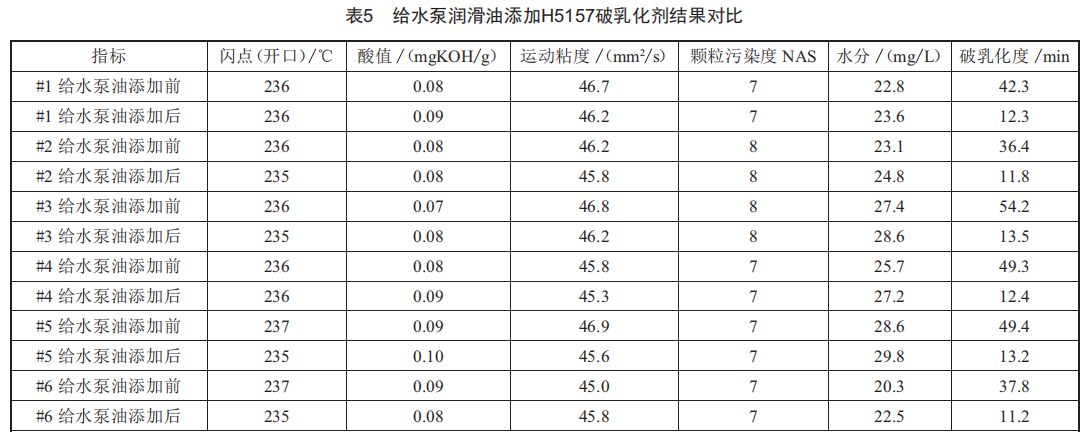 對于破乳化度超標、其他指標正常的潤滑油,合理添加破乳化劑H5157、n330均能起到明顯改善破乳化度的效果。但是,破乳化劑n330存在使?jié)櫥烷W點降低、顆粒污染度上升的風險。添加破乳化劑H5157則能在不改變潤滑油閃點、酸值、粘度、顆粒污染度、水分等主要指標的前提下將潤滑油的破乳化值降低到與新油接近的水平,且6臺給水泵潤滑油實際添加H5157后均取得了較好的效果。
