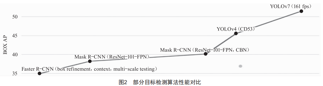 部分目標檢測算法性能對比如圖2所示,可以發(fā)現(xiàn),一階段算法YOLOv7平均精度上高于二階段算法FaSter-RCNN,且YOLOv7在速度上也具有很大優(yōu)勢。因此,本文也采用最新的YOLOv7目標檢測算法來進行研究。