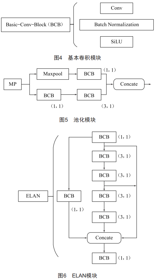 YOLOv7的骨干網(wǎng)絡(luò)由若干基本卷積塊(BaSic-Conv-Block,以下簡稱BCB塊)構(gòu)成,如圖4所示,BCB塊包含一次卷積操作、一次批歸一化操作和一次利用SiLU激活函數(shù)激活的操作。BCB塊中卷積層的卷積操作有(1,1)、(3,1)、(3,2)三種形式,以(3,2)的BCB塊為例,其表示為用3×3的卷積核進行步長為2的卷積操作。