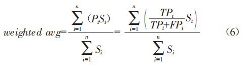 5ewgitedavg為加權(quán)平均,其計(jì)算方式是對(duì)某個(gè)指標(biāo)求其所有類別指標(biāo)值的加權(quán)平均,記si表示支持第i類的樣本數(shù),以精確率Pi為例,Pi的5ewgitedavg計(jì)算公式如下: