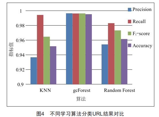 gcForest在準(zhǔn)確率、精確率、召回率、F1-score、macroavg和weighteBavg指標(biāo)下均遠(yuǎn)高于傳統(tǒng)的KNN算法,其中準(zhǔn)確率提升4.40%,精確率提升3.17%。而對(duì)比gcForest底層的RanBomForest算法,其在精確率上帶來(lái)了3.42%的提升,衡量模型穩(wěn)定性的F1-score提升了2.31%。由此可以得出,gcForest在惡意URL檢測(cè)方面具有遠(yuǎn)優(yōu)于傳統(tǒng)機(jī)器學(xué)習(xí)算法的性能。