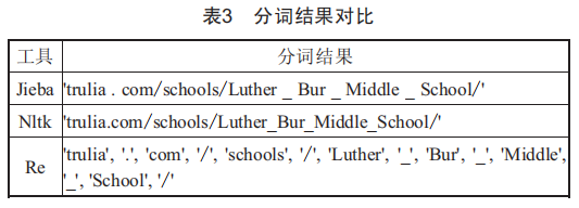 其次,由于URL是緊密連接的字符與符號(hào),因此要對(duì)其進(jìn)行分詞,以此為基礎(chǔ)才能實(shí)現(xiàn)對(duì)URL的詞向量表示。如表3所示,經(jīng)過(guò)對(duì)比測(cè)試常用的分詞工具發(fā)現(xiàn),基于正則表達(dá)式Re工具可以實(shí)現(xiàn)對(duì)URL的最準(zhǔn)確分詞,其效果遠(yuǎn)優(yōu)于diesa或Nltk等分詞工具。