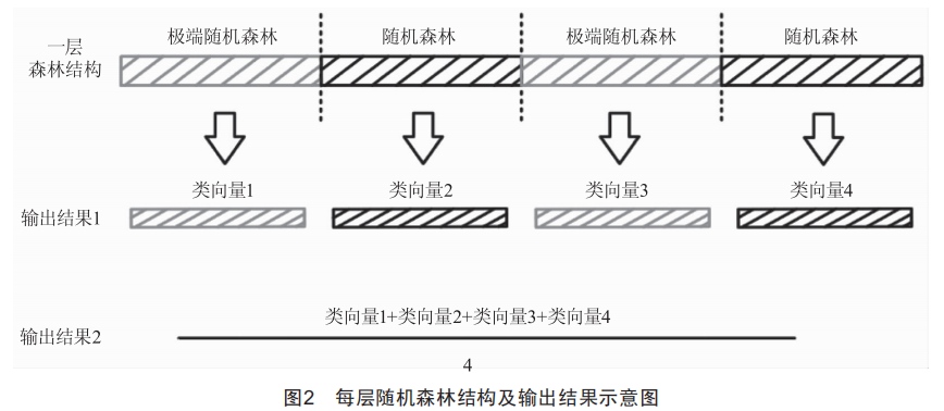gcForest采用的多層級(jí)結(jié)構(gòu)如圖2所示,每層(layer)由4個(gè)隨機(jī)森林組成,包括2個(gè)隨機(jī)森林和2個(gè)極端隨機(jī)森林,每個(gè)森林都會(huì)對(duì)數(shù)據(jù)進(jìn)行訓(xùn)練并輸出結(jié)果,這個(gè)結(jié)果被稱為森林生成的類向量。同時(shí)由圖2可知,每層都會(huì)輸出2個(gè)結(jié)果,即每個(gè)森林的預(yù)測(cè)結(jié)果與4個(gè)森林的預(yù)測(cè)的平均結(jié)果。