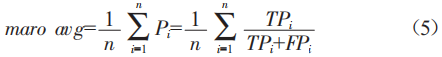 maroavg為宏平均,其計(jì)算方式是對(duì)某個(gè)指標(biāo)求其所有類別指標(biāo)值的算術(shù)平均,以精確率Pi為例,Pi的maroavg計(jì)算公式如下: