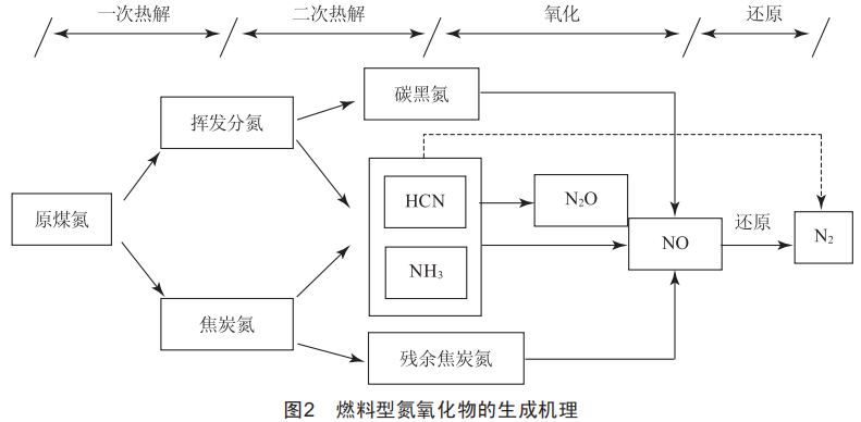 大量的研究表明,污染物氣體氮氧化物的排放量與鍋爐的燃燒過程存在著密切的聯(lián)系。燃燒過程中生成的三類氮氧化物中,燃料型氮氧化物的占比最大,它是由燃料中的氮化合物發(fā)生熱分解、氧化而生成的。燃料型氮氧化物的生成機理如圖2所示。