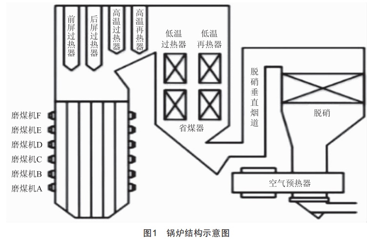 圖1為煤粉爐機組鍋爐結構示意圖。在實際工作過程中,經(jīng)過磨煤機破碎、研磨、干燥后將滿足細度要求的煤粉經(jīng)一次風輸送到爐膛內進行燃燒放熱,其中,每臺磨煤機可滿足爐內同一高度燃燒器的煤粉量需求。爐內還布置有大量的換熱設備,包括低溫過、再熱器,高溫過、再熱器以及前、后屏過熱器。過熱器的主要作用是熱量交換,將爐內燃燒生成的煙氣熱轉化為蒸汽熱,從而為汽輪機做功提供良好動力。此外,為維持煙氣在爐內的正常流動,需要滿足平衡通風的要求,鍋爐空氣側采用正壓運行方式以克服送風流程中的阻力,鍋爐煙氣側則采用微負壓運行方式以減少爐膛和尾部煙道的漏風量。