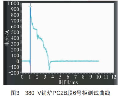 (3)380V鍋爐PC2B段位于鍋爐側(cè)6.3m配電間,末級直流開關(guān)額定電流6A,直流饋線屏位于鍋爐側(cè)0m直流室,第一級直流開關(guān)32A、40A。直流電纜長度較短,本級斷路器出口處實(shí)際短路649.2~701.6A,達(dá)到斷路器額定電流的20~17.5倍,整個(gè)短路持續(xù)時(shí)間2.16~2.5ms。短路電流達(dá)到32A第一級斷路器短路瞬時(shí)動(dòng)作值,越級跳閘,結(jié)果不滿足級差配合要求:短路電流未達(dá)到40A第一級斷路器短路瞬時(shí)動(dòng)作值,未越級跳閘。短路電流測試曲線如圖3所示,結(jié)果滿足級差配合要求。