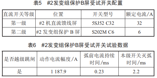 (3)#2發(fā)變組保護(hù)B屏試驗(yàn),本回路直流開關(guān)配置參數(shù)如表5所示,試驗(yàn)數(shù)據(jù)如表6所示。