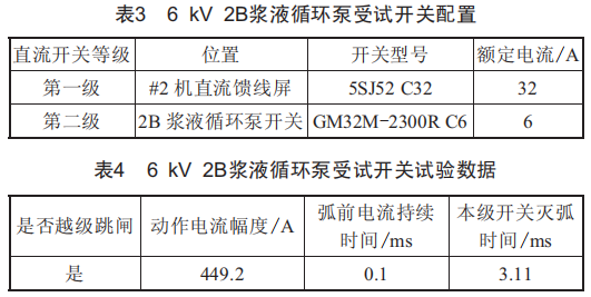 (2)6kV2B漿液循環(huán)泵開關(guān)試驗(yàn),本回路直流開關(guān)配置參數(shù)如表3所示,試驗(yàn)數(shù)據(jù)如表4所示。