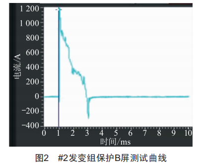 (2)#2發(fā)變組保護(hù)B屏位于鍋爐側(cè)12.6m電子間,末級直流開關(guān)額定電流6A,直流饋線屏位于鍋爐側(cè)0m直流室,第一級直流開關(guān)32A。直流電纜長度較短,電流線徑選項(xiàng)偏大,本級斷路器出口處實(shí)際短路1187.9A,達(dá)到斷路器額定電流的37倍,整個(gè)短路持續(xù)時(shí)間2.43ms,短路電流達(dá)到第一級斷路器短路瞬時(shí)動(dòng)作值,越級跳閘。短路電流測試曲線如圖2所示,結(jié)果不滿足級差配合要求。