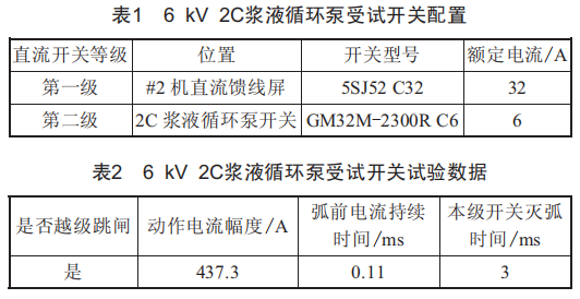 (1)6kV2C漿液循環(huán)泵開關(guān)試驗(yàn),本回路直流開關(guān)配置參數(shù)如表1所示,試驗(yàn)數(shù)據(jù)如表2所示。