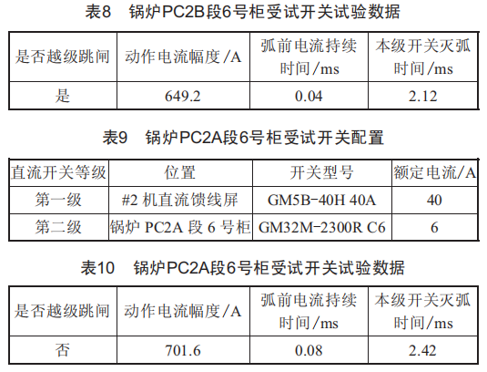 (5)380V鍋爐PC2A段6號柜試驗(yàn),本回路直流開關(guān)配置參數(shù)如表9所示,試驗(yàn)數(shù)據(jù)如表10所示。