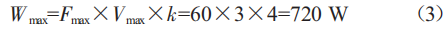 根據(jù)國家機械行業(yè)標準《圓弧齒同步帶傳動第3部分:設(shè)計方法》(JB/T7512.3—2014)來設(shè)計和選擇同步帶。經(jīng)理論分析和實際測算,考慮靜摩擦力的因素,工作臺開始拖動最大拉力Fmax=60N,運動平穩(wěn)后,拉力為47N,工作臺移動速度一般為0.8m/s,最大移動速度不會超過vmax=3m/s,考慮到同步帶低轉(zhuǎn)速的情況多,將工況系數(shù)增加到k=2~4,最大功率Wmax按照式(3)進行估算。