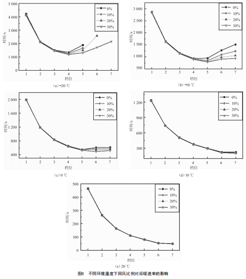 (1)最高升溫速率對(duì)應(yīng)的風(fēng)量往往不是最大風(fēng)量,而是與環(huán)境溫度相關(guān)。環(huán)境溫度為20℃時(shí),最佳采暖風(fēng)量為7擋,隨著環(huán)境溫度下降,與之對(duì)應(yīng)的采暖風(fēng)量逐漸降低,環(huán)境溫度為-20℃時(shí),最佳采暖風(fēng)量為4擋。