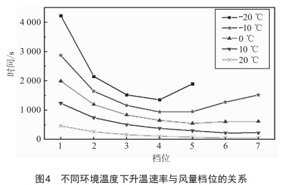 為適應(yīng)人群差異及使用需求,汽車空調(diào)出風(fēng)設(shè)置有多個(gè)檔位。在采暖初始階段,用戶普遍認(rèn)為風(fēng)量越大采暖效果越好,艙內(nèi)溫度將更快達(dá)到目標(biāo)溫度。若忽略風(fēng)速對(duì)乘員熱舒適性的影響,僅以乘員艙升溫速率作為評(píng)價(jià)指標(biāo),由于外循環(huán)時(shí)空調(diào)系統(tǒng)負(fù)荷大,最高擋風(fēng)量并不一定就是最佳采暖方案。