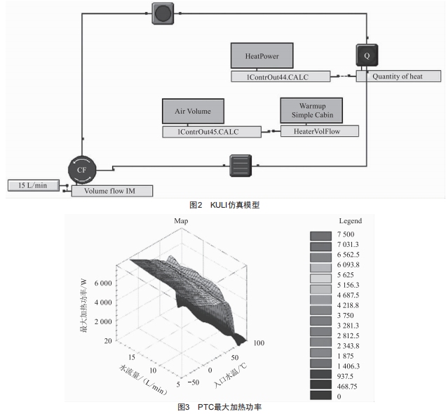 該系統(tǒng)中采用的PTC為水暖加熱器,最大加熱功率為7.5kw,熱效率為0.9。在實(shí)際使用過(guò)程中,由于水溫和水流量的限制,PTC往往不能工作在期望的功率下,其最大加熱功率與入口水溫和水流量之間的關(guān)系如圖3所示。水泵功率為100w,鼓風(fēng)機(jī)共有7個(gè)檔位,不同檔位下采暖風(fēng)量與功率如表1所示。