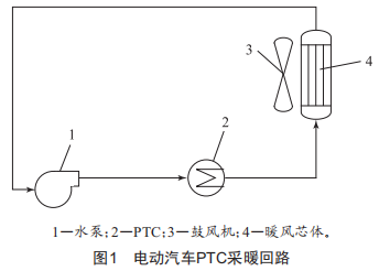 以PTC作為采暖部件的電動(dòng)汽車采暖回路如圖1所示,其主要由水泵、PTC、暖風(fēng)芯體和鼓風(fēng)機(jī)等組成,電機(jī)余熱回收及電池加熱本文暫不考慮。