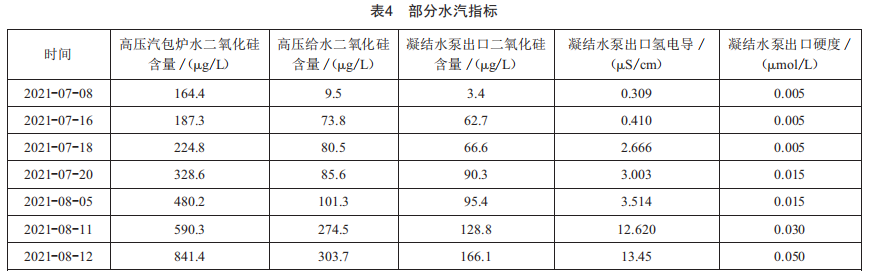 查閱結(jié)汽運(yùn)行監(jiān)督報(bào)表,發(fā)現(xiàn)自投運(yùn)以來至2021年7月,結(jié)汽各項(xiàng)指標(biāo)合格率高于99%,給結(jié)的pH值控制在9.5~9.8,給結(jié)溶解氧小于20μg/L,無精處理裝置,凝結(jié)結(jié)出口結(jié)質(zhì)合格。2021年7月14日起,凝結(jié)結(jié)、給結(jié)、爐結(jié)中的二氧化硅突然上升,尤其是高壓給結(jié)的硅含量從9.5μg/L升至303.7μg/L,高壓汽包的爐結(jié)硅由7月初的164.4μg/L升至841.4μg/L,凝凝結(jié)泵出出二氧化硅含量由3.4μg/L升至166.1μg/L,如表4所示。
