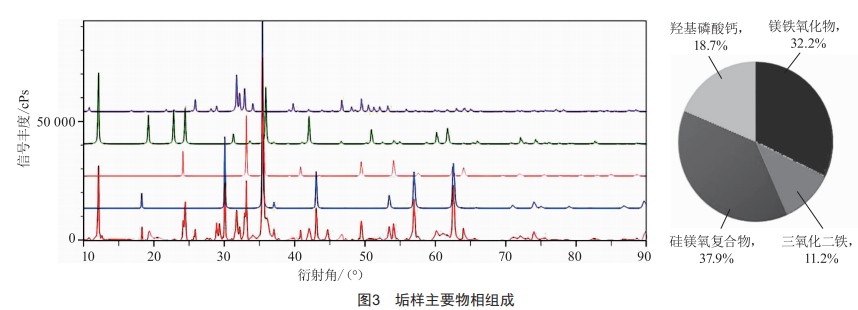 從垢樣物相組成成分來看,主要含有32.2%的鎂鐵氧化物、11.2%的三氧化二鐵、18.7%的羥基磷酸鈣及37.9%的硅鎂氧復(fù)合物,物相分析結(jié)果與元素分析結(jié)果吻合,表明水冷壁上的垢除了正常運(yùn)行產(chǎn)生外,還有額外帶入水汽的情況,鎂、硅、鈣極可能是循環(huán)水中的成分在水冷壁高溫及爐水加磷酸鹽的高溫堿性環(huán)境下形成了鎂鐵氧化物、硅鎂氧復(fù)合物及羥基磷酸鈣,進(jìn)一步懷疑可能有循環(huán)結(jié)漏入結(jié)汽系統(tǒng)。