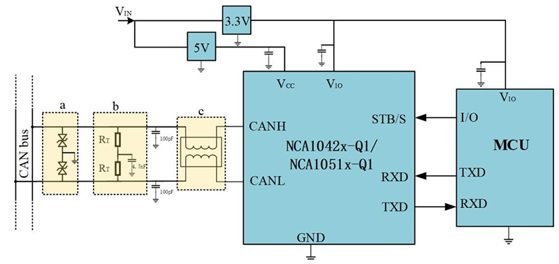 NCA1042B-Q1和NCA1051A-Q1 CAN收發(fā)器芯片邏輯I/O工作電平在2.8~5.5V范圍內(nèi),可支持3.3V和5V MCU 的I/O電平。