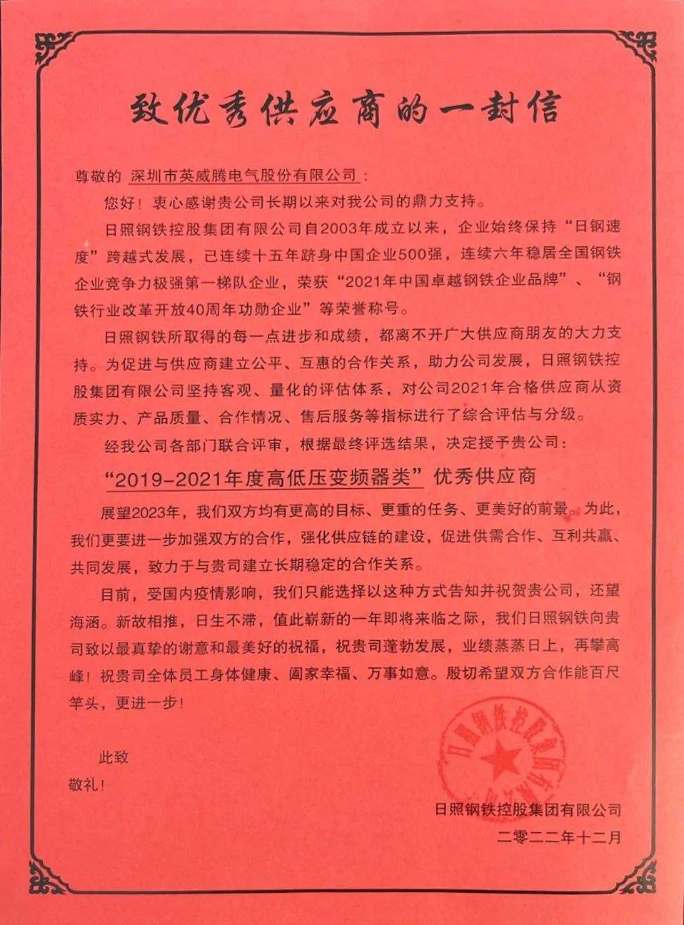 英威騰x日照鋼鐵 | 實(shí)現(xiàn)降本增效提質(zhì),榮獲優(yōu)秀供應(yīng)商!