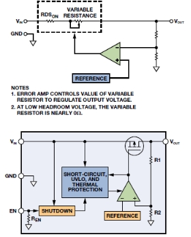 客戶經(jīng)常向應用工程師請教LDO在壓差模式下的PSRR。起初,這似乎是個合理的問題,但只要看看簡化的框圖,就知道這個問題毫無意義。當LDO工作在壓差模式時,調整FET的可變電阻部分為零,輸出電壓等于輸入電壓減去通過調整FET的RDSON的負載電流而引起的壓降。LDO不進行調節(jié),也沒有用來抑制輸入噪聲的增益;它僅充當一個電阻。FET的RDSON與輸出電容形成RC濾波器,可提供少量的殘余PSRR,但簡單的電阻或鐵氧體磁珠可以更經(jīng)濟有效地完成同一任務。