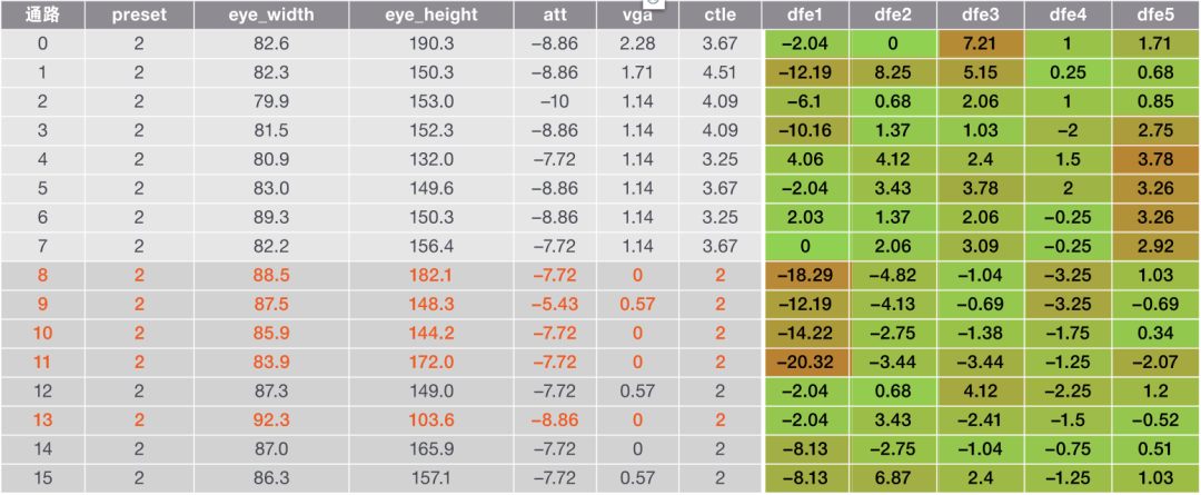在Gen 4速度下未能形成鏈路后,TMT4被調(diào)整以在Gen 3速度下測(cè)試DUT。在調(diào)節(jié)到Gen 3速度后,TMT4能夠與DUT形成鏈路。通過(guò)在Excel電子表格中進(jìn)行一些基本分析,這家制造商能夠輕松地可視化問(wèn)題發(fā)生在哪里。如下表所示,幾乎不需要均衡就能把插槽的高8條通路上的眼圖張開(kāi),但低8條通路上有一些通路有問(wèn)題,如紅字所示。