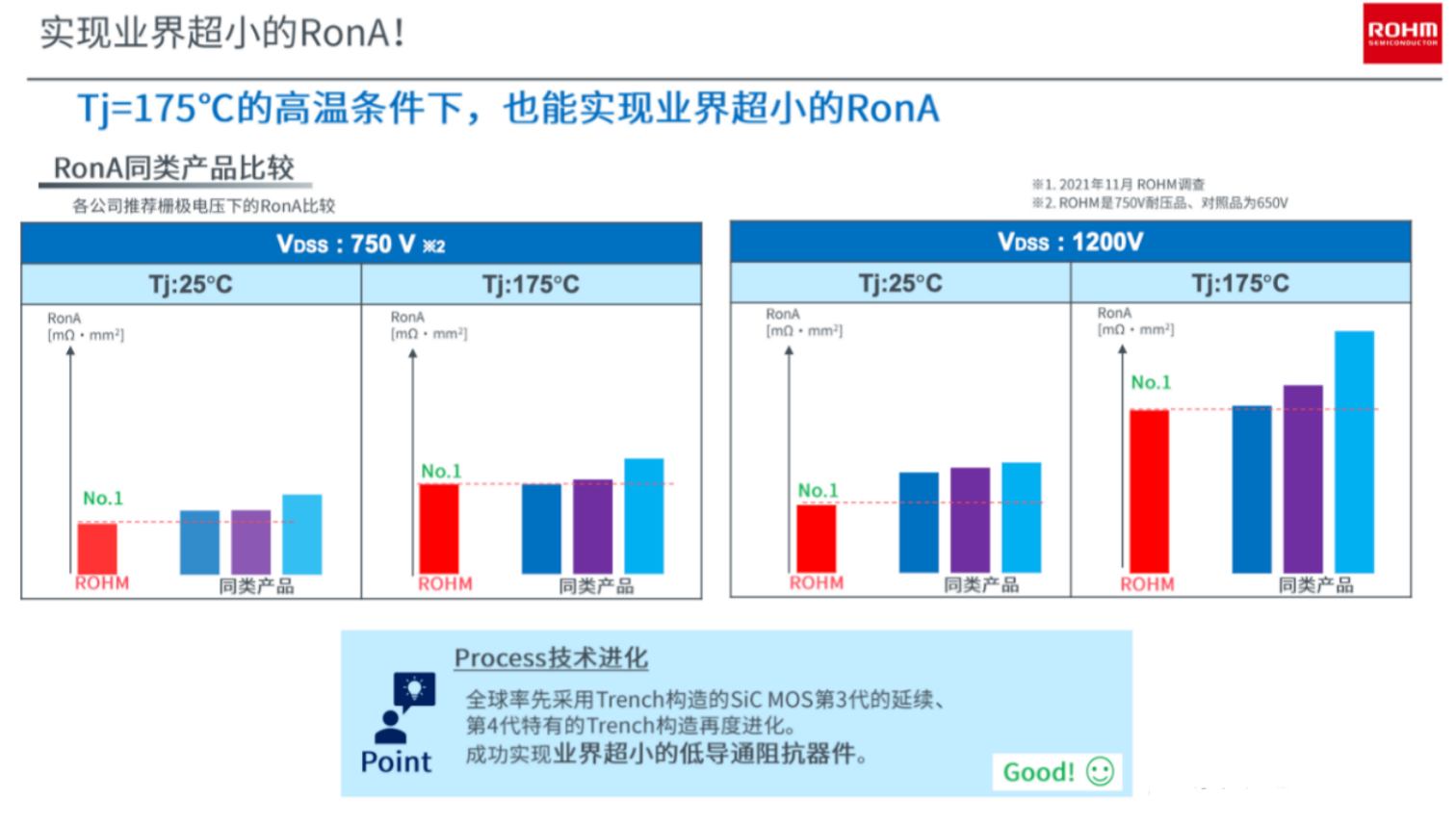 除了RonA外,第4代SiC MOSFET的另一個(gè)進(jìn)化方向是耐壓。據(jù)介紹,第3代產(chǎn)品是650V系列耐壓,到了第4代產(chǎn)品從650V提高到750V。