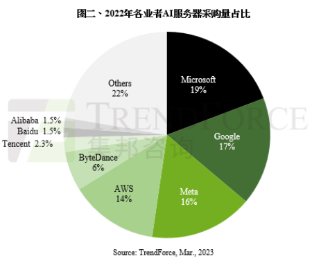 據(jù)TrendForce集邦咨詢統(tǒng)計,2022年AI服務器采購占比以北美四大云端業(yè)者Google、AWS、Meta、Microsoft合計占66.2%為最,而中國近年來隨著國產(chǎn)化力道加劇,AI建設(shè)浪潮隨之增溫,以ByteDance的采購力道最為顯著,年采購占比達6.2%,其次緊接在后的則是Tencent、Alibaba與Baidu,分別約為2.3%、1.5%與1.5%。