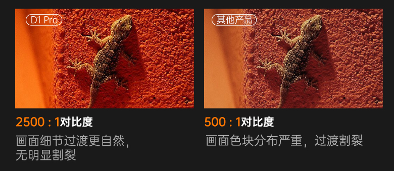 其次是對比度,優(yōu)秀的畫面顯示,除了提高亮度以外,更重要的是控制黑位,也就是全黑畫面下控制漏光的能力。對比度差的投影儀在進行側(cè)投時,顯示畫面意外會有明顯的發(fā)白畫面,這就是黑位控制不好的原因。