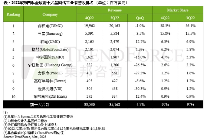 TrendForce集邦咨詢:2022年第四季前十大晶圓代工產(chǎn)值環(huán)比減少4.7%,今年第一季持續(xù)下滑