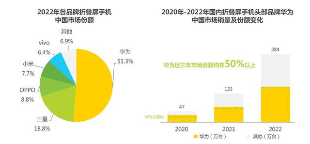 近日,艾瑞咨詢研究院發(fā)布了《2023年中國折疊屏手機(jī)市場洞察報告》,數(shù)據(jù)顯示,2022年華為折疊屏手機(jī)的市場份額達(dá)到了51.3%,占據(jù)了國內(nèi)折疊屏市場的半壁江山,同時連續(xù)三年位居國內(nèi)折疊屏市場榜首。這個數(shù)據(jù)意味著,中國每兩臺折疊屏手機(jī)就有一臺是華為品牌,通過多年耕耘,華為折疊機(jī)已經(jīng)牢牢樹立起了高端、優(yōu)質(zhì)的形象,并以極高的用戶認(rèn)可度贏得了市場。