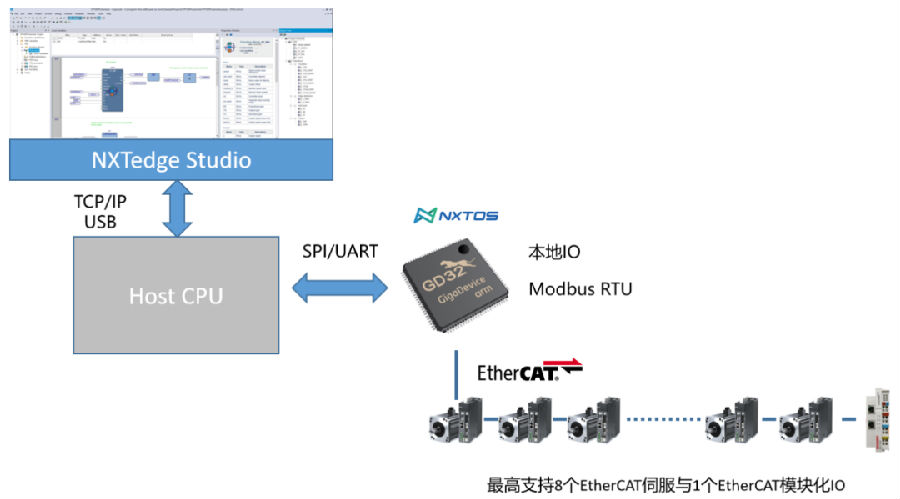 除了通過單芯片實(shí)現(xiàn)支持EtherCAT功能的PLC解決方案外,該方案同時(shí)支持將GD32F470芯片作為獨(dú)立的協(xié)處理器與第三方處理器進(jìn)行通訊,將實(shí)時(shí)性要求較高的應(yīng)用由GD32F470+NXTOS完成,而在HOST處理器上則無(wú)需進(jìn)行實(shí)時(shí)性優(yōu)化,通過SPI/UART接口與GD32F470通訊,從而實(shí)現(xiàn)接入工業(yè)控制系統(tǒng):