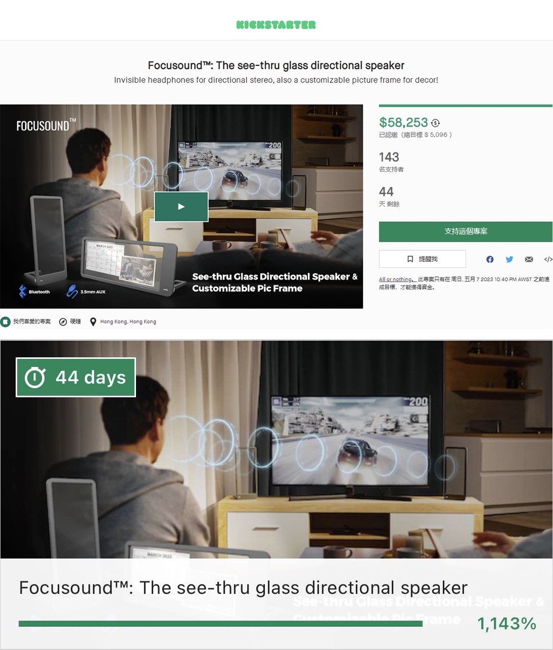 3月23日,美國東部時間11點(北京時間3月23日23點),清聽聲學(xué)聚音屏Focusound Screen®全透明屏幕定向發(fā)聲音箱正式在美國Kickstarter開放眾籌。根據(jù)ks眾籌頁面數(shù)據(jù)顯示,這款定向音箱目前已有143名支持者,上線1小時已達(dá)成目標(biāo)金額,10小時眾籌完成率高達(dá)1143%,遠(yuǎn)超預(yù)期的眾籌目標(biāo)(數(shù)據(jù)截止發(fā)稿前)。