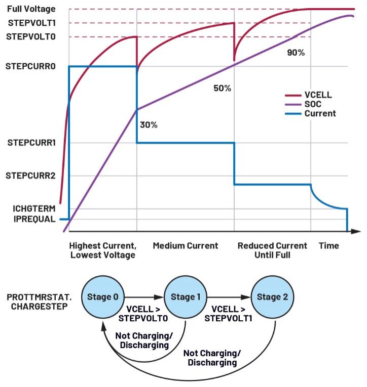 圖7.步進(jìn)充電曲線,使用狀態(tài)機(jī)來(lái)管理各級(jí)之間的轉(zhuǎn)換。