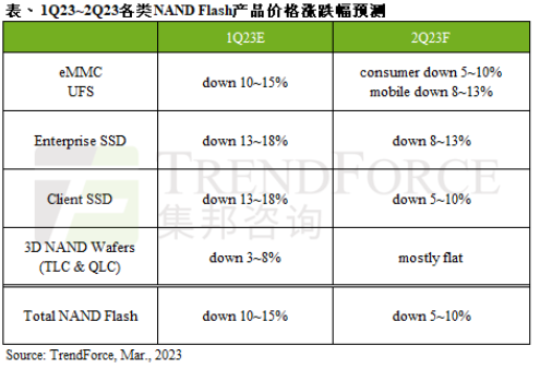 Enterprise SSD方面,受惠于中國云端服務(wù)供應(yīng)商服務(wù)器需求近期有所提升,以及AMD Genoa平臺(tái)開始放量,有望帶動(dòng)Enterprise SSD出貨。盡管供過于求的情況使第二季價(jià)格仍難逃跌勢(shì),但目前NAND Flash銷售已面臨大幅虧損,各供應(yīng)商未來的議價(jià)幅度逐漸縮小,預(yù)估第二季Enterprise SSD價(jià)格跌幅有望收斂至8~13%。